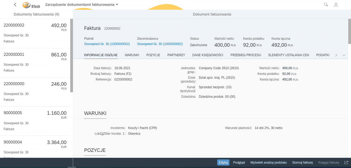• wyświetlenie informacji o firmie, warunków płatności (na przykład zapłać natychmiast bez potrąceń), warunków incoterms i problemy z dokumentami rozliczeniowymi